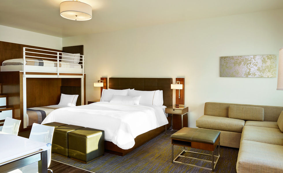 The addition of a family suite, introduced bunk beds to the brand, furnishing a room to sleep up to six people. The indoor pool design was elevated to include warm wood tones and splashes of bright blue and green to evoke the sense of water and relaxation.