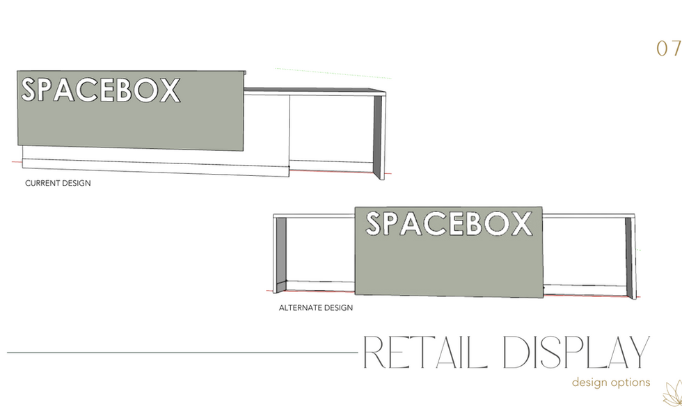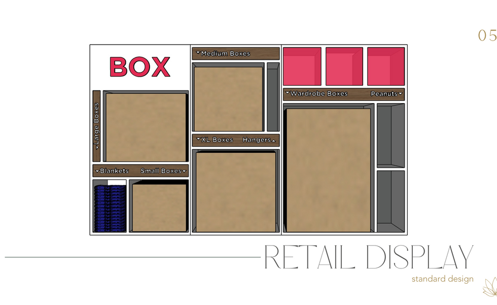 Playing with geometric lines and shapes, the design pushes the retail display to think out of the BOX by offering a variety of shelving and mesh metal hanging displays; curated to entice the customer and provide necessary supplies while encouraging impulse purchases at the same time.